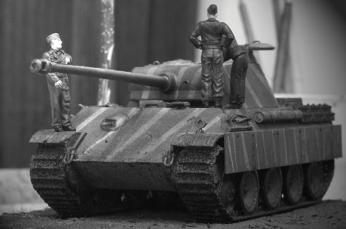 Methods. The Panther was assembled according to the instruction and was air brushed with matt black as basic color. Later the Panther was air brushed with Tamiya XF60 as basic color. The 3M tapes were teared by hand randomly and were applied to the XF60 air brushed Panther as the distictive diagnonal stripped camouflage. The Panther was air brushed with Tamiya XF60 and then XF64. The 3M tapes were teared off from the Panther by hand after the air brush was completed. The tracks were not painted with color but applied with shoe polish with teeth brush. The Panther was also applied with shoe polish to increase the metal effect. The tracks and wheels were applied with dry coffee ground mixed with diluted white glue. The figures were cut and remodeled according to the picture and painted with Tamiy XF1 and XF65. The foam board was cut as circle shape and was applied with dry coffee ground mixed with diluted white glue as diorama. The whole diarama was not yet completed and still had much to be improved.